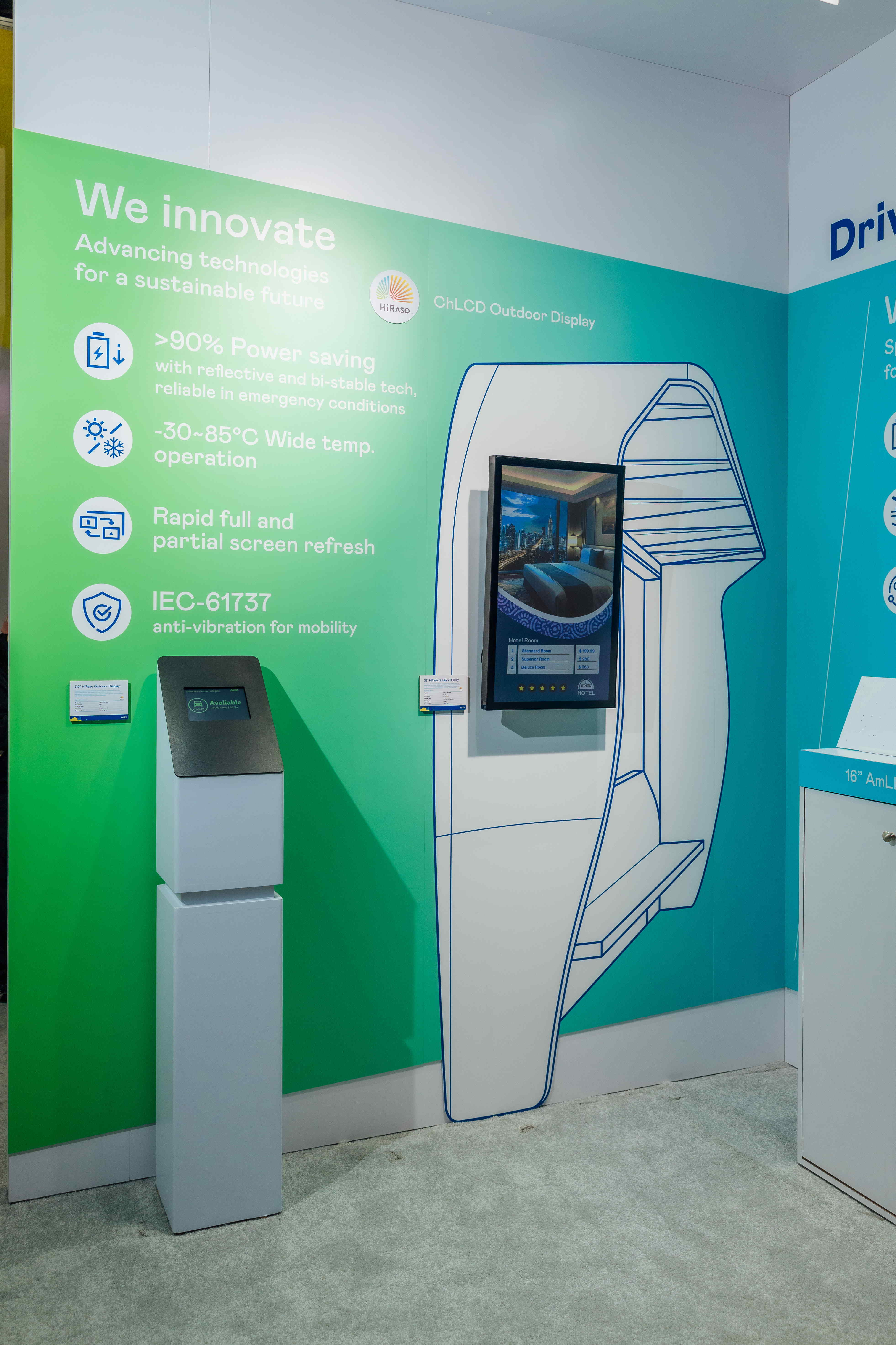 HiRaso膽固醇液晶顯示器運用反射環境光線的方式,呈現影像顯示時零耗能的環保省電訴求,光線愈強愈能呈現絕佳的色彩飽和度及顯示效果,同時在攝氏-30度至85度間寬溫的使用優勢,為戶外電子看板的新首選。